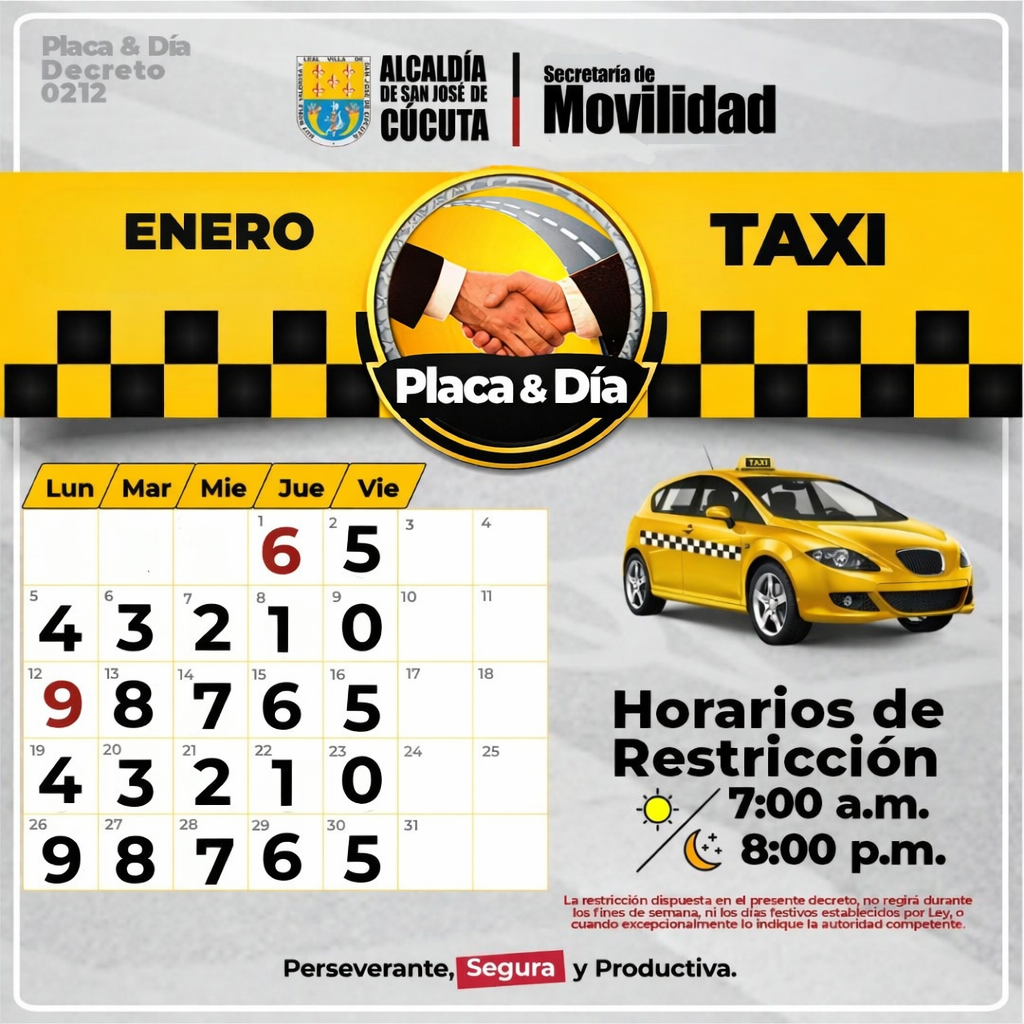 La Alcaldía de San José de Cúcuta, a través de la Secretaría de Movilidad, implementa el Pico y Placa para taxis durante el mes de enero, con el objetivo de mejorar la movilidad y optimizar la circulación vehicular en la ciudad. La medida aplica de lunes a viernes, en el horario comprendido entre 7:00 a.m.